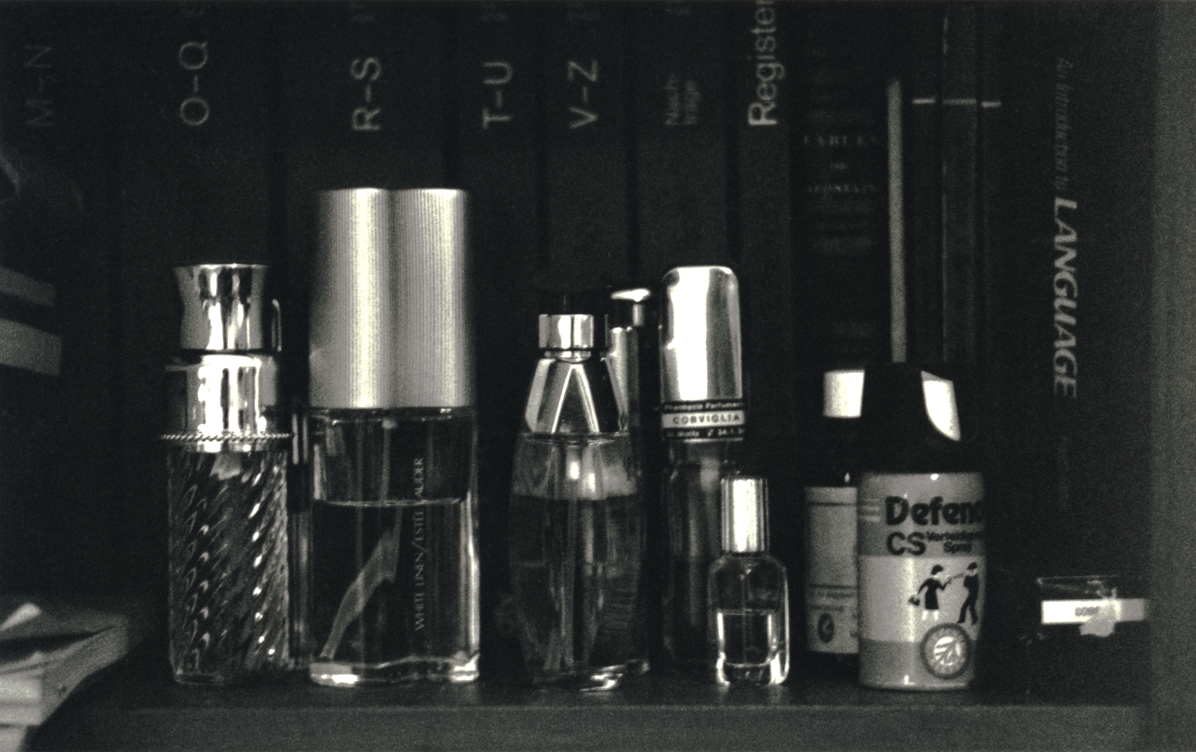 Die zufällige Begegnung verschiedenster Sphären: Pfefferspray neben Parfum vor Lexikon.